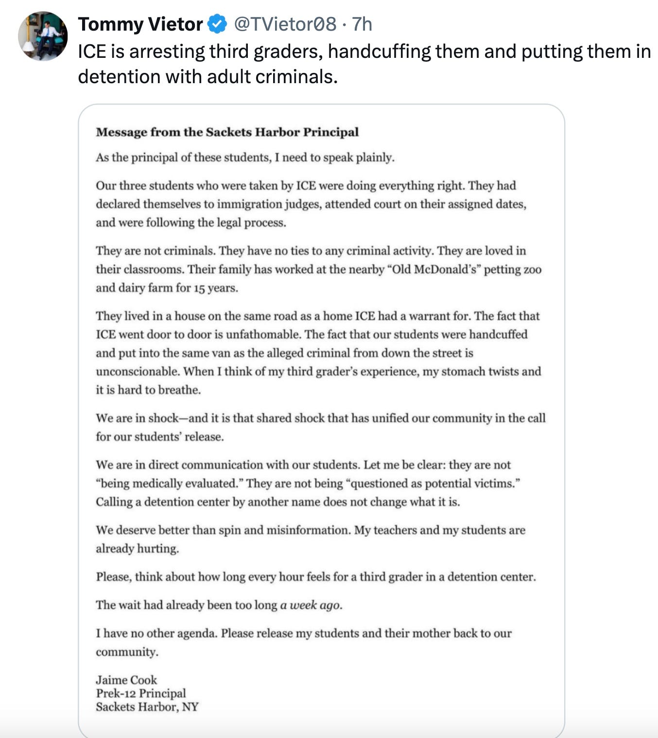 Why It Matters: New York Governor Kathy Hochul called the arrests “just plain cruel” and demanded the family’s return. Outrage is growing over Trump’s aggressive tactics—especially after reports that young children were handcuffed during the operation. It is reprehensible.